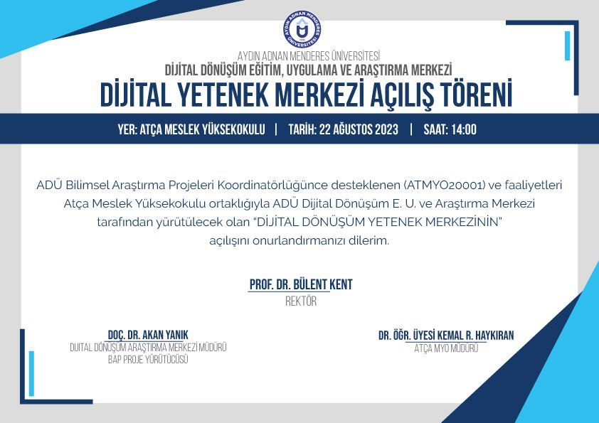 Türkiye’nin ilk Dijital Dönüşüm Eğitim, Uygulama ve Araştırma Merkezi olan ADÜ DDM, 22 Ağustos 2023 tarihinde saat 14:00'da ADÜ Atça Kampüsünde Dijital Yetenek Merkezi'nin açılışını gerçekleştiriyor. Türkiye’deki üniversiteler içinde ilk ve tek niteliği taşıyan Dijital Yetenek Merkezi robotik kodlama, İHA, 3D baskı, grafik tasarım, sıfır atık el sanatları, radyo yayın, video yayıncılık ve fotoğraf çekim atölyeleriyle hizmete açılıyor.