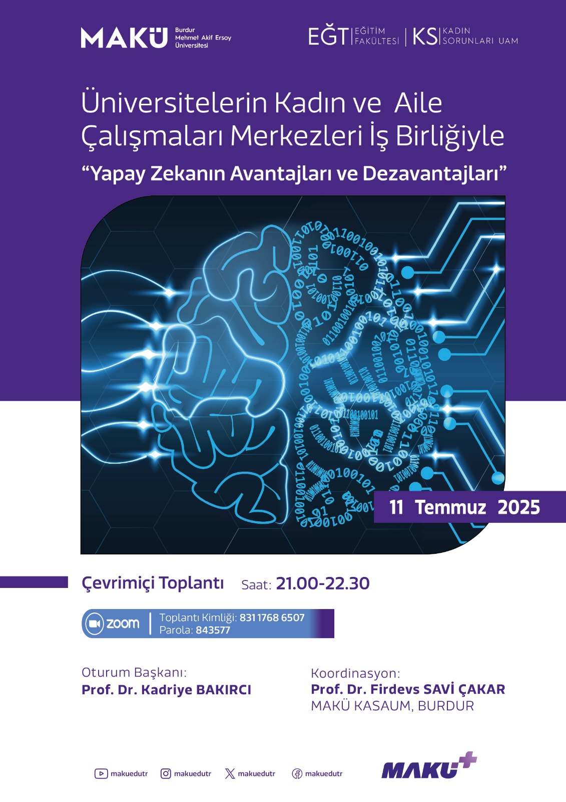 11 Temmuz 2025 tarihinde Burdur Mehmet Akif Ersoy Üniversitesi Kadın ve Aile Çalışmaları Merkezi'nin yönetiminde düzenlenen "Üniversitelerin Kadın ve Aile Çalışmaları Merkezleri İşbirliğiyle Yapay Zekanın Avantajları ve Dezavantajları" toplantısına merkezimiz adına Merkez Müdür Öğr. Gör. Dilek Akıcı katılım sağlamış ve toplantıda yapay zeka konusunda merkezimizin yaptığı işbirliği çalışmaları hakkında bilgiler sunmuştur.