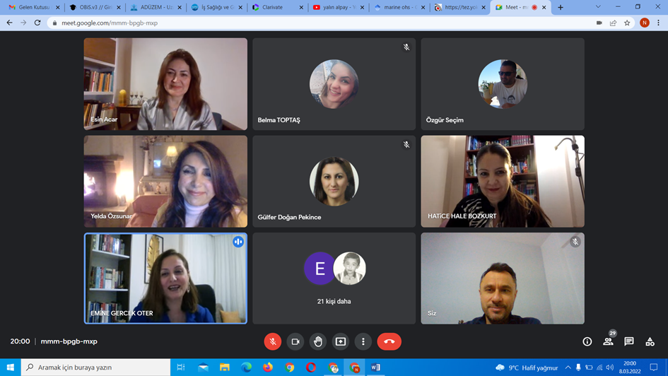Üniversitemiz Kadın ve Aile Çalışmaları Uygulama ve Araştırma Merkezi tarafından “8 Mart Dünya Kadın Emekçiler Günü” kapsamında Google meet platformu üzerinden 8 Mart 2022 tarihinde on line panel düzenlendi. Panele Merkez Müdürü Doç. Dr. Emine Gerçek Öter, Müdür Yardımcısı Doç. Dr. Seher Sarıkaya Karabudak, Merkez Yönetim Kurulu Üyeleri Prof. Dr. Hüseyin Üreten, Doç. Dr. Tuncay Ercan Sepetçioğlu, Dr. Öğr. Üy. Bilge Yaşan Şair ile panelistler Tıp Fakültesi Radyoloji AD. Öğretim Üyesi ve Hemşirelik Fakültesi Dekanı Prof. Dr. Yelda Özsunar, İletişim Fakültesi Halkla İlişkiler ve Reklamcılık Bölümü Halkla İlişkiler AD. Öğretim Üyesi ve İletişim Fakültesi Dekanı Prof. Dr. Hatice Hale Bozkurt ve Eğitim Fakültesi Temel Eğitim Bölümü Sınıf Eğitimi AD. Öğretim Üyesi ve Kadın ve Aile Çalışmaları Uygulama ve Araştırma Merkezi Yönetim Kurulu Üyesi Prof. Dr. Esin Acar ile üniversitemiz ve farklı üniversitelerden akademisyenler, lisansüstü ve lisans öğrencileri katıldı.