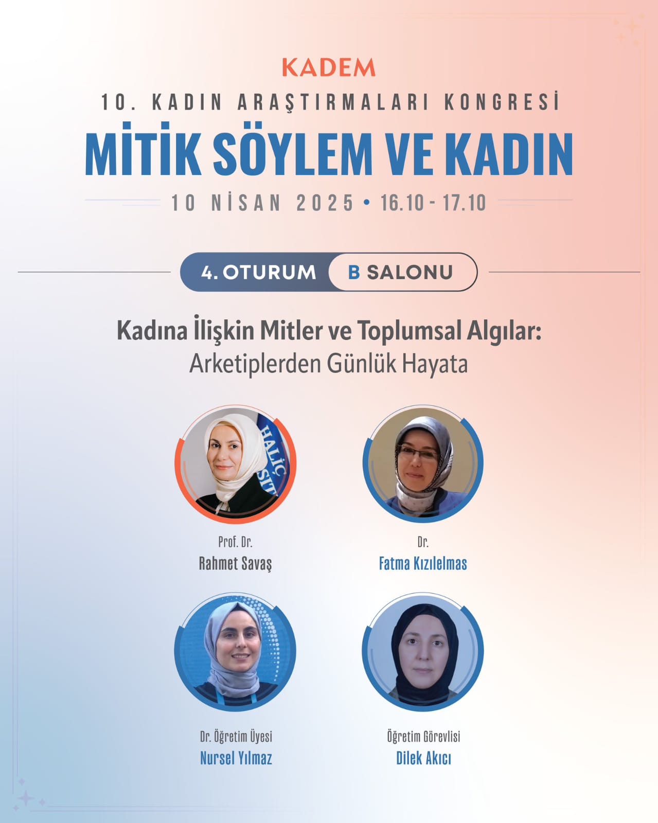 10.04.2025 tarihinde İstanbul Üniversitesi Beyazıt YerleÅŸkesi'nde yapılan Mitik Söylem ve Kadın baÅŸlığıyla düzenlenen KADEM 10. Kadın AraÅŸtırmaları Kongresi'nde, merkezimiz adına ÖÄŸr. Gör. Dilek Akıcı, “Türk Mitolojisinde Kadın Karakterlerin Arketipsel Analizi” baÅŸlıklı bildirisini sözlü olarak sunmuÅŸtur. Merkez Müdürü ÖÄŸr. Gör. Dilek Akıcı'nın sunumu, bildiri özetleri kitabında yayınlanmıştır ve tam metin bildiri olarak da yayınlanmıştır.
