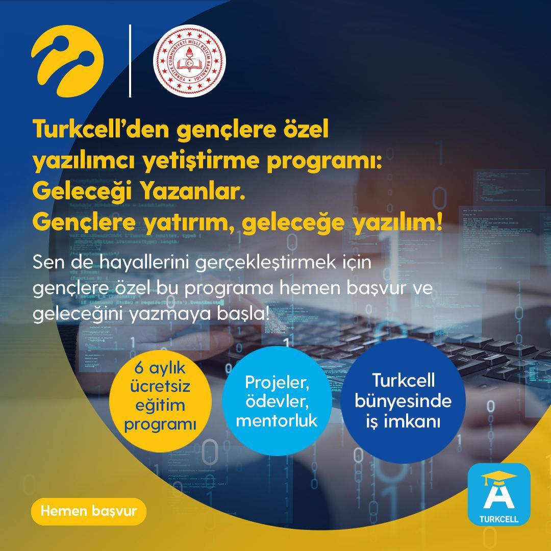 Turkcell Geleceği Yazanlar, Gençlere Yatırım, Geleceğe Yazılım! programı başvuruları başladı. Program kapsamında eğitime katılanlar ücretsiz eğitim, projeler, mentorluk ve Turkcell bünyesinde çalışma fırsatı gibi birçok fırsat elde ediyor.