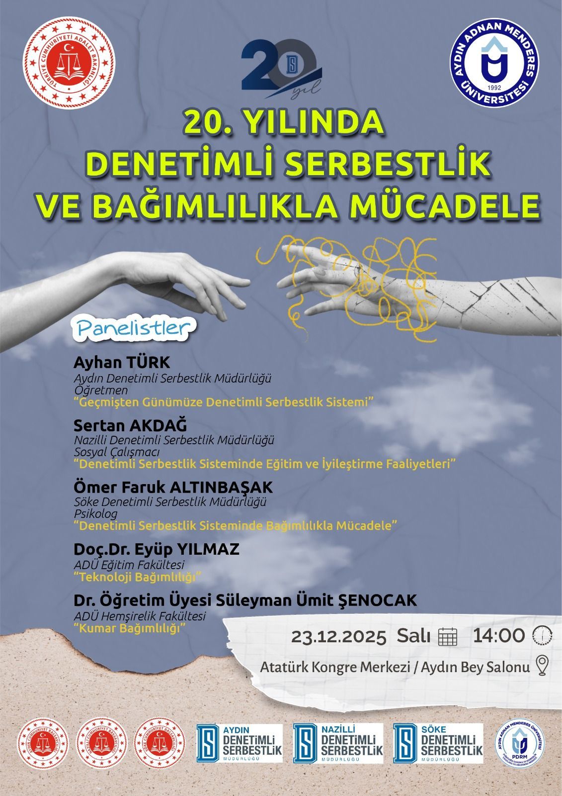 Merkezimiz tarafından, Aydın Denetimli Serbestlik Müdürlüğü işbirliğinde, 23.12.2025 Salı günü saat 14.00' de Atatürk Kongre Merkezi Aydın Bey Salonu’ nda, "20. Yılında Denetimli Serbestlik ve Bağımlılıkla Mücadele" konulu panel düzenlenecektir. Panel afişi ekte sunulmuştur.