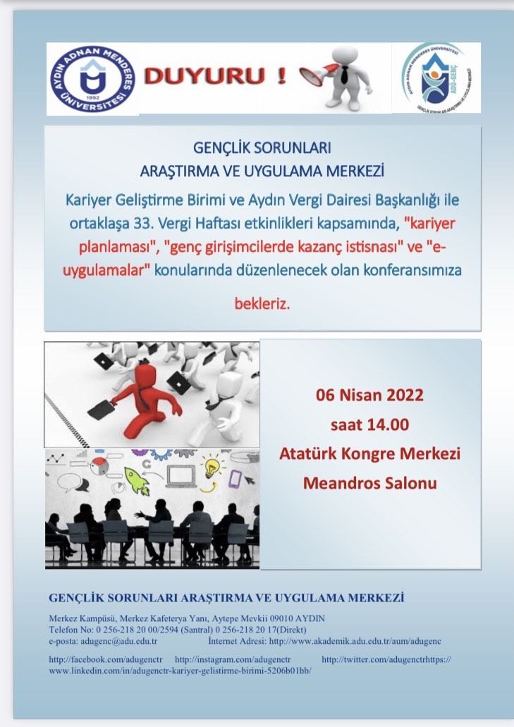 Merkezimiz ve Aydın Vergi Dairesi BaÅŸkanlığı ile ortaklaÅŸa olarak, 33. Vergi Haftası etkinlikleri kapsamında, "kariyer planlaması", "genç giriÅŸimcilerde kazanç istisnası", "Gelir İdaresi BaÅŸkanlığı' nın tanıtımı" ve "e-uygulamalar" gibi konularda öÄŸrencilerimizin bilgilendirilmesi, kariyer geliÅŸimleri açısından faydalı olacağı düÅŸünülerek 6 Nisan 2022 tarihinde ÇarÅŸamba günü saat 14.00' de Atatürk Kongre Merkezi Meandros Salonu' nda yapılacaktır.