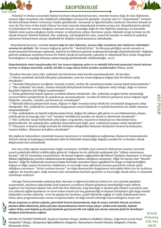 Sayın hocalarım ve sevgili öÄŸrenciler, ADÜ PDRM olarak “Haftanın Yazısı” isimli yeni bir çalışmaya baÅŸladık. Her hafta düzenli olarak psikolojik saÄŸlıkla ilgili yazılar paylaÅŸacağımız bu uygulamayla sizleri bilgilendirmeyi amaçlıyoruz. "Ekopsikoloji" baÅŸlıklı ikinci yazımızı Klinik Psikolog Elif Nur AKIN kaleme aldı, yararlanmanız dileÄŸiyle…Prof.Dr.YaÅŸar KUZUCU(PDRM Müdürü)