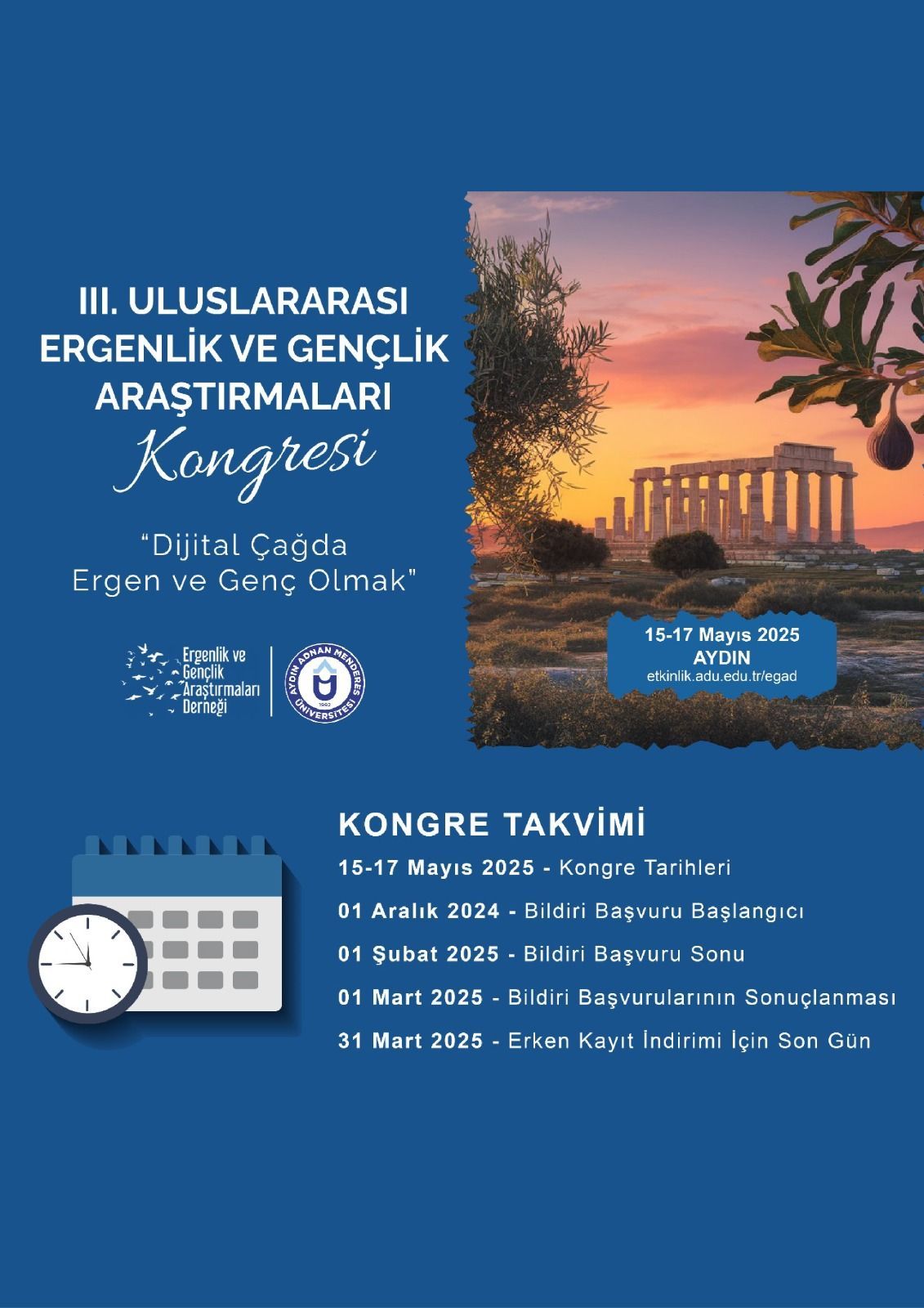 Üniversitemiz ev sahipliÄŸinde, Merkezimiz, EÄŸitim Fakültesi ve Ergenlik ve Gençlik AraÅŸtırmaları DerneÄŸi (EGAD) iÅŸbirliÄŸinde 15-17 Mayıs 2025 tarihleri arasında "Dijital ÇaÄŸda Ergen ve Genç Olmak" temasıyla "III. Uluslararası Ergenlik ve Gençlik AraÅŸtırmaları Kongresi" düzenlenecektir.