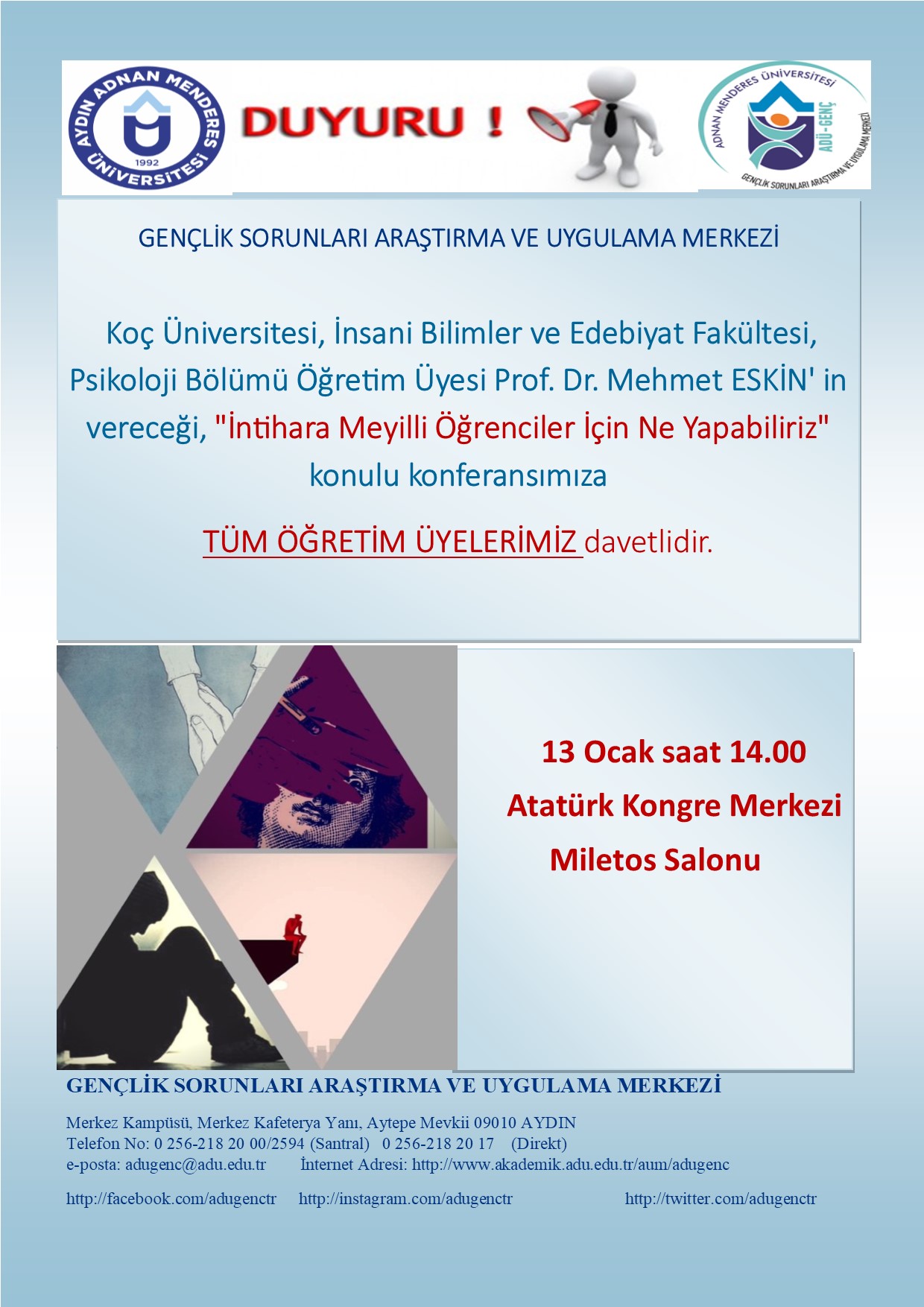 13 Ocak Pazartesi saat 14.00 'de Atatürk Kongre Merkezi Miletos Salonu' nda, Prof.Dr.Mehmet ESKİN 'in "İntihara Meyilli Öğrenciler İçin Ne Yapabiliriz" konulu konferansımıza tüm öğretim üyelerimiz davetlidir.