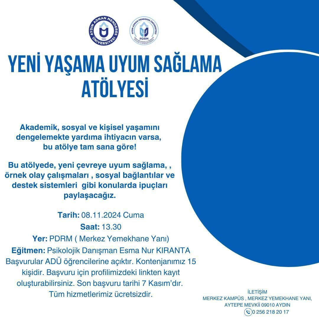 Merkezimizde görevli Psikolojik Danışman Esma Nur KIRANTA tarafından 08.11.2024 tarihinde "Yeni YaÅŸama Uyum SaÄŸlama” konulu atölye çalışması yapılmış ve 13 öÄŸrencimiz bu çalışmadan yararlanmıştır.